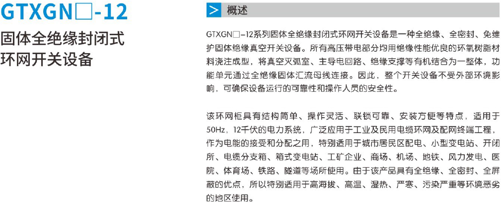 GTXGND-12系列固體全絕緣封閉式環(huán)網(wǎng)開關(guān)設(shè)備是一種全絕緣、 全密封、免維