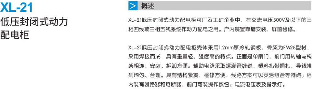 XL-21低壓封閉式動(dòng)力配電柜殼體采用1.2mm厚冷軋鋼板,骨架為FM28型材,